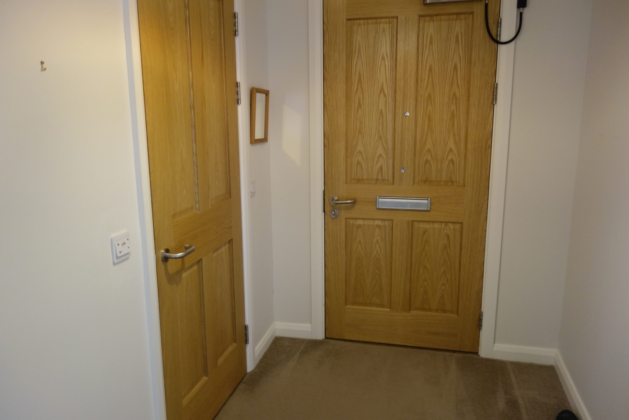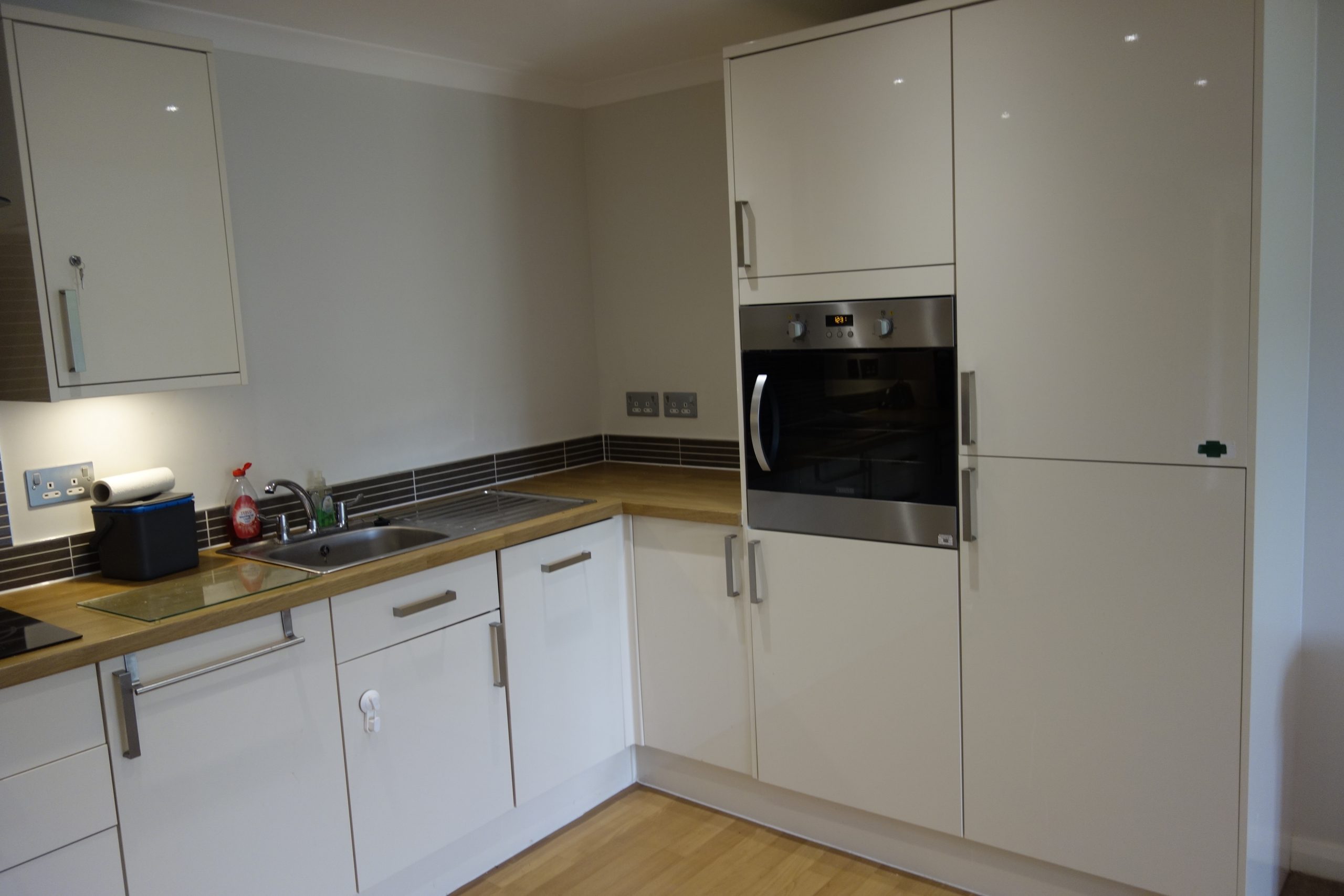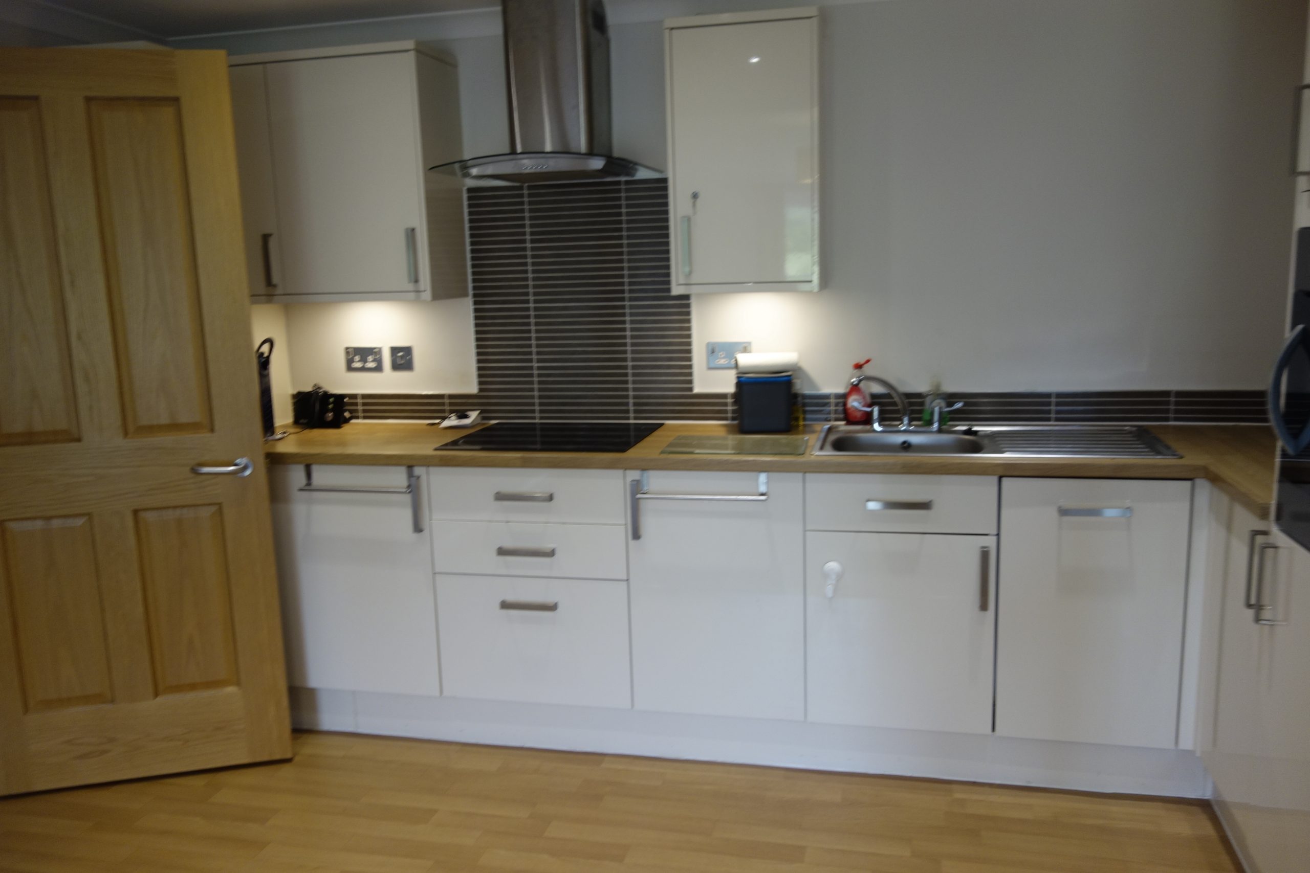 Property comprises of entry hallway with storage cupboards which also houses the washing machine. Large open plan lounge/kitchen with modern fitted gloss units with oak worktops, integrated appliances.