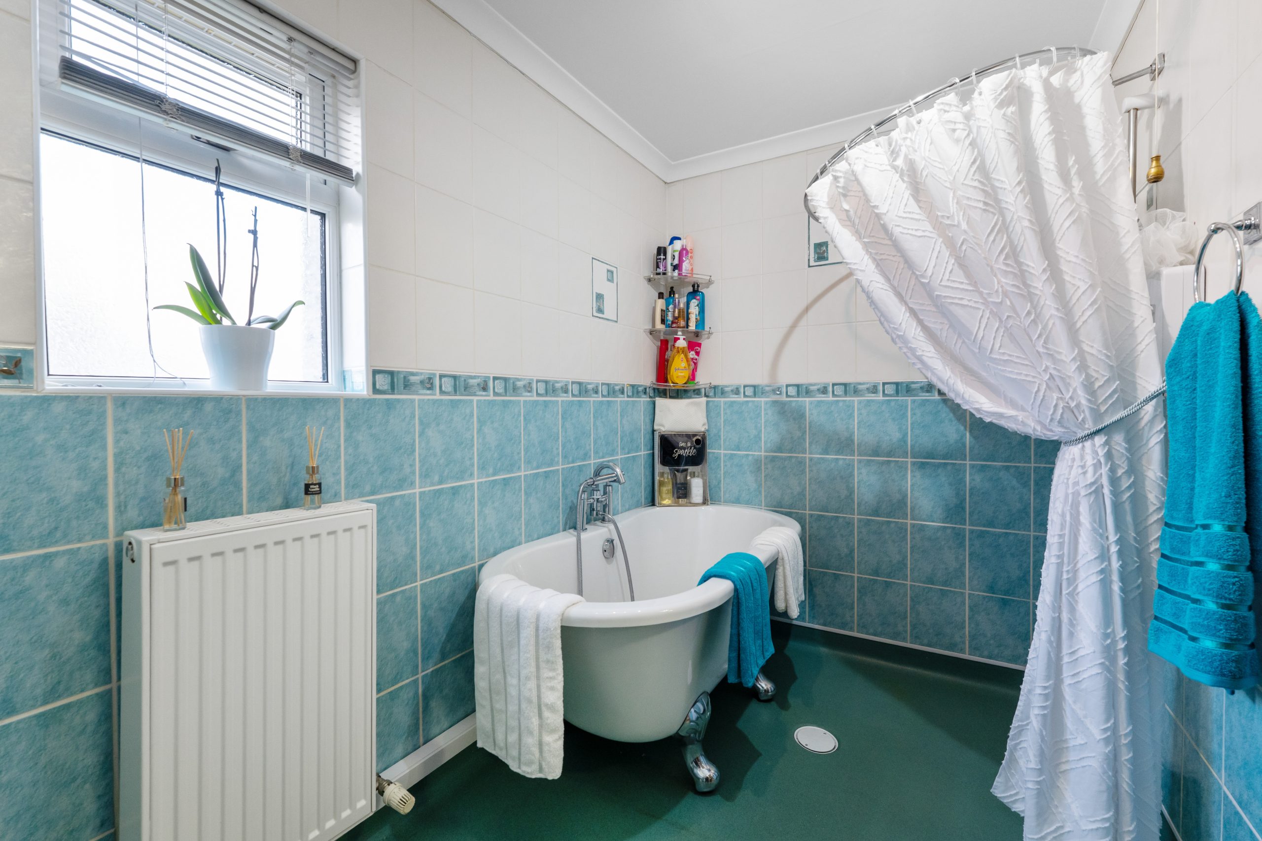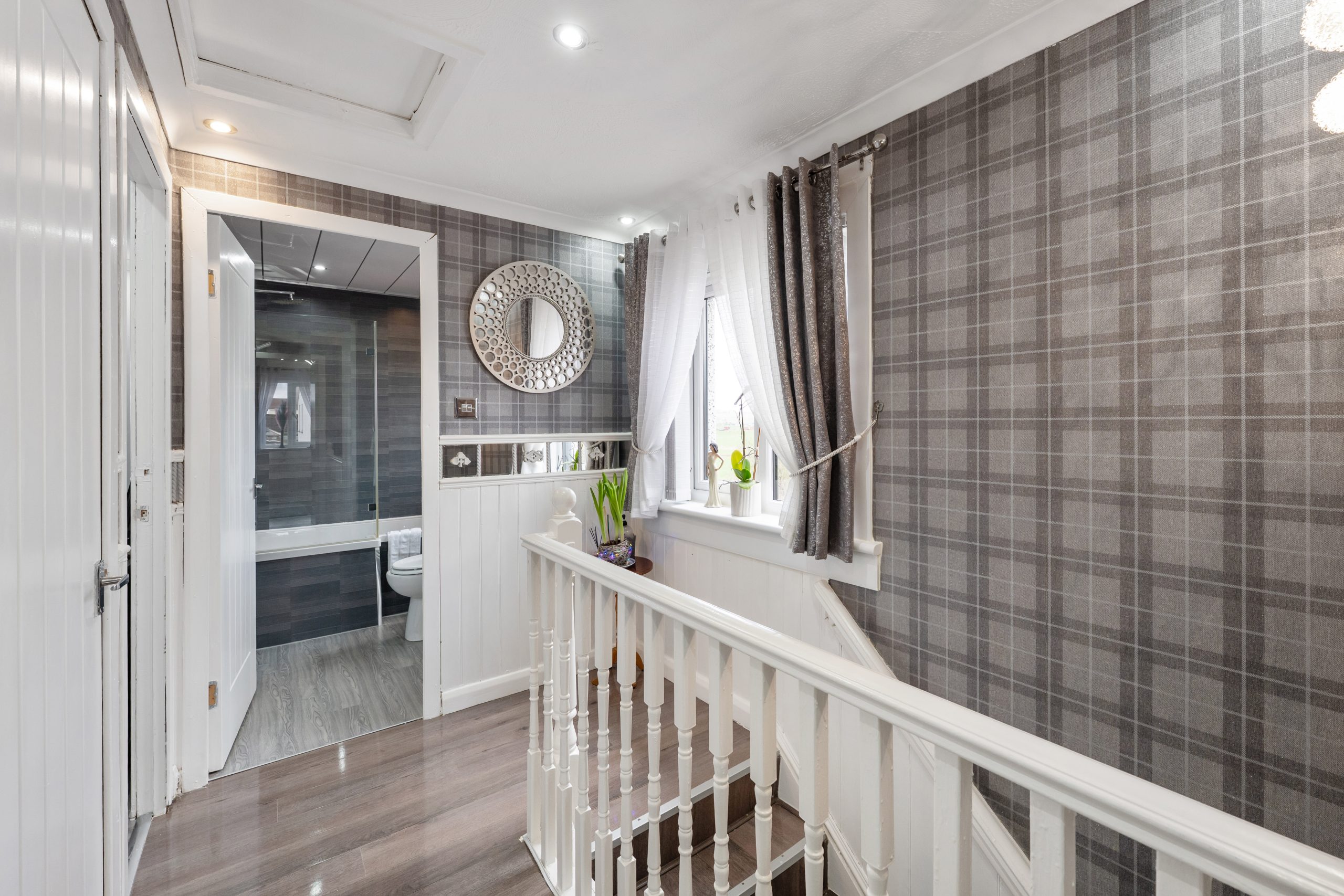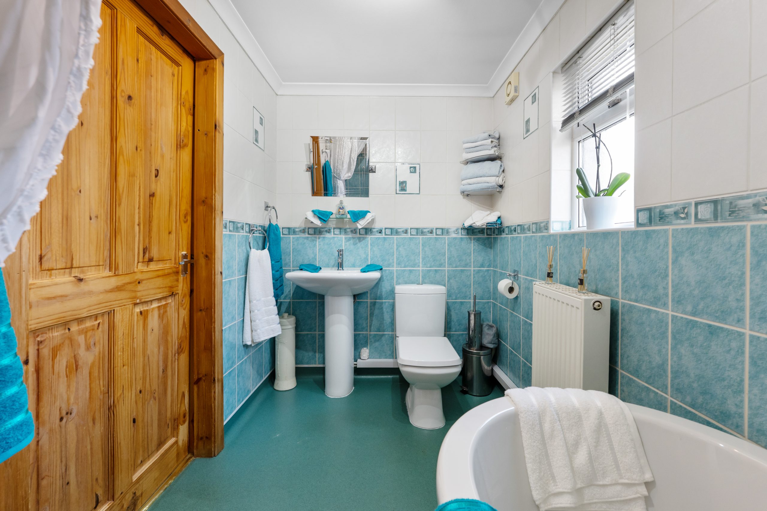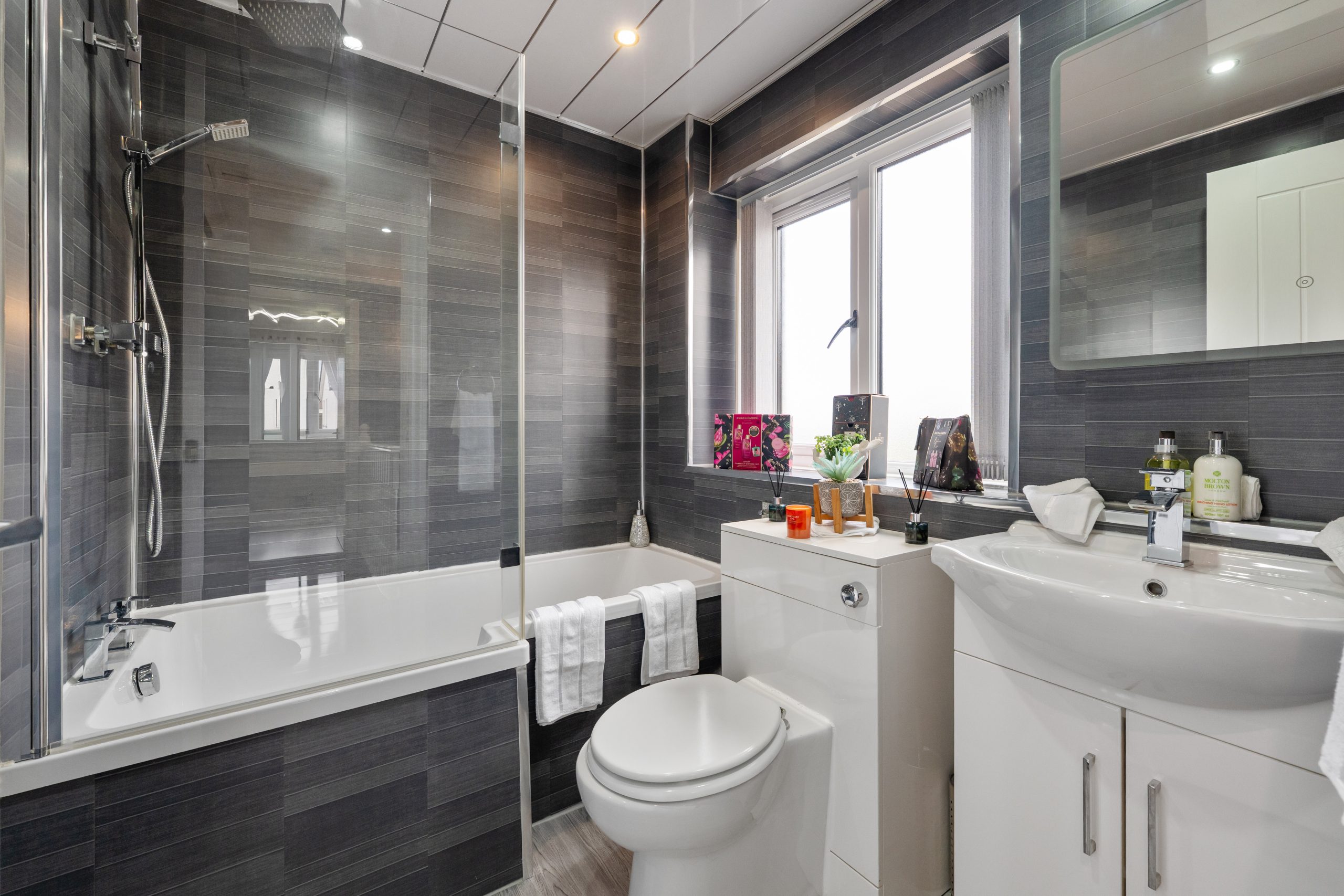 Family bathroom which is fully fitted and has a lovely white suite with modern bath and shower, wetwall panelling finish throughout.