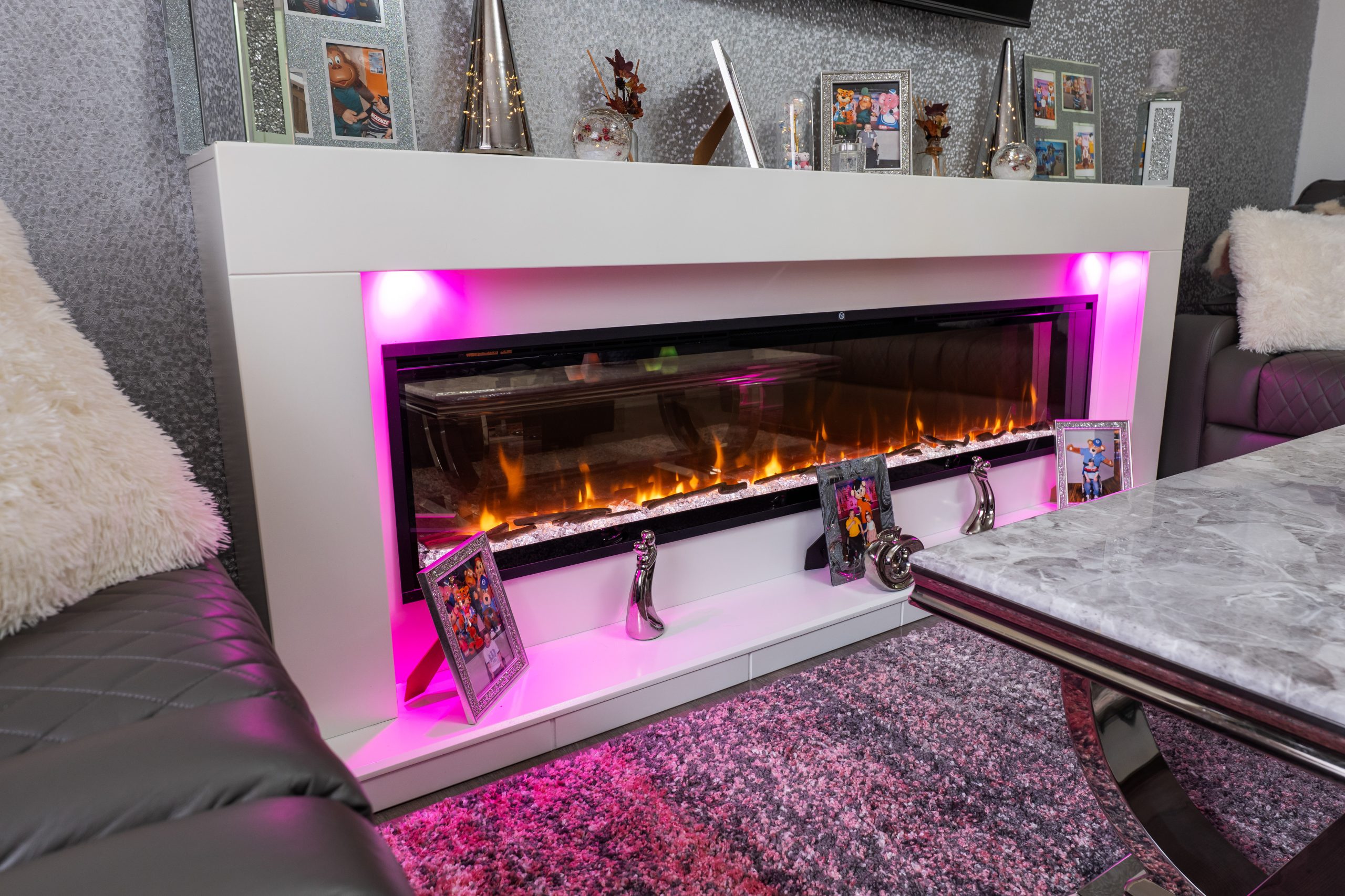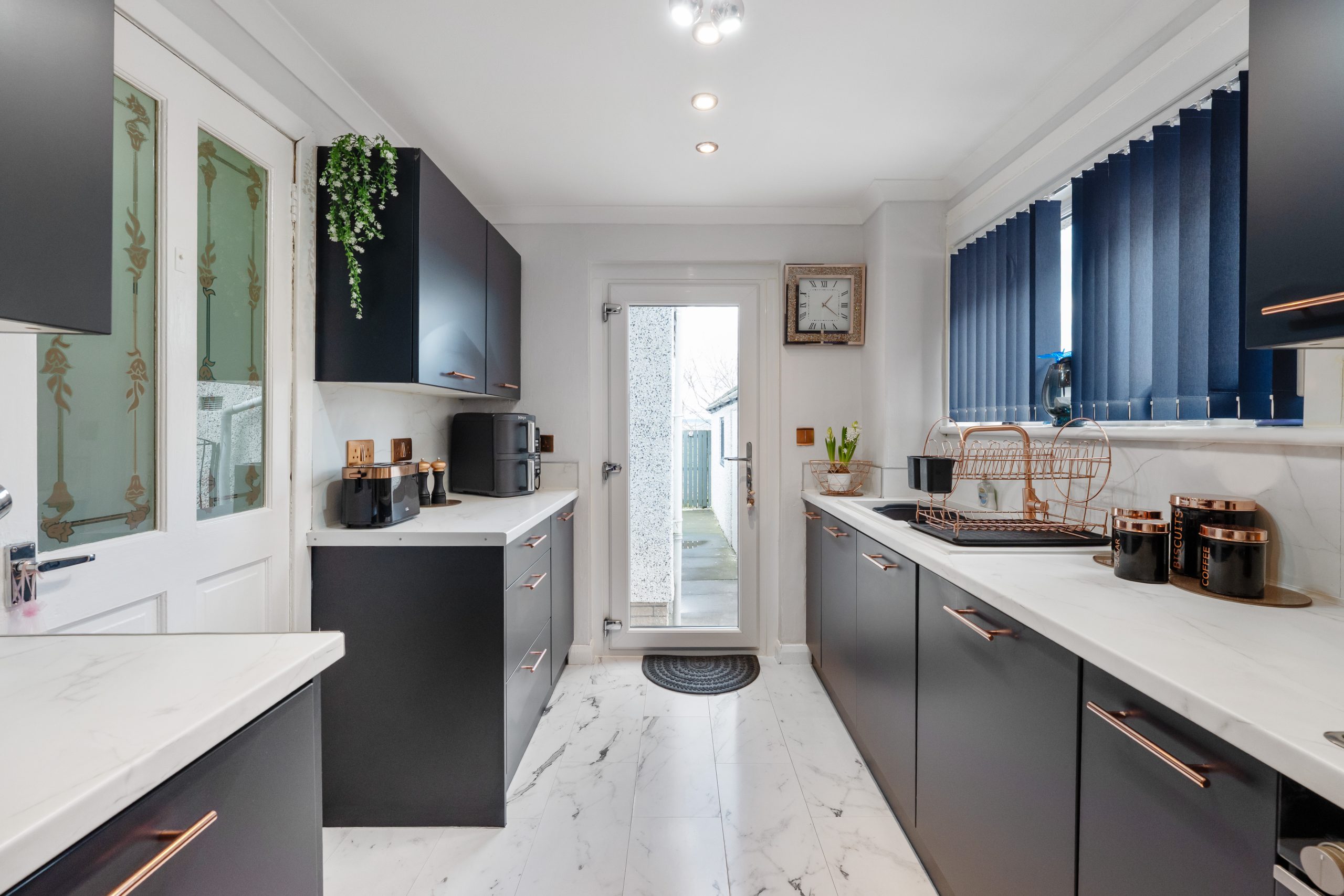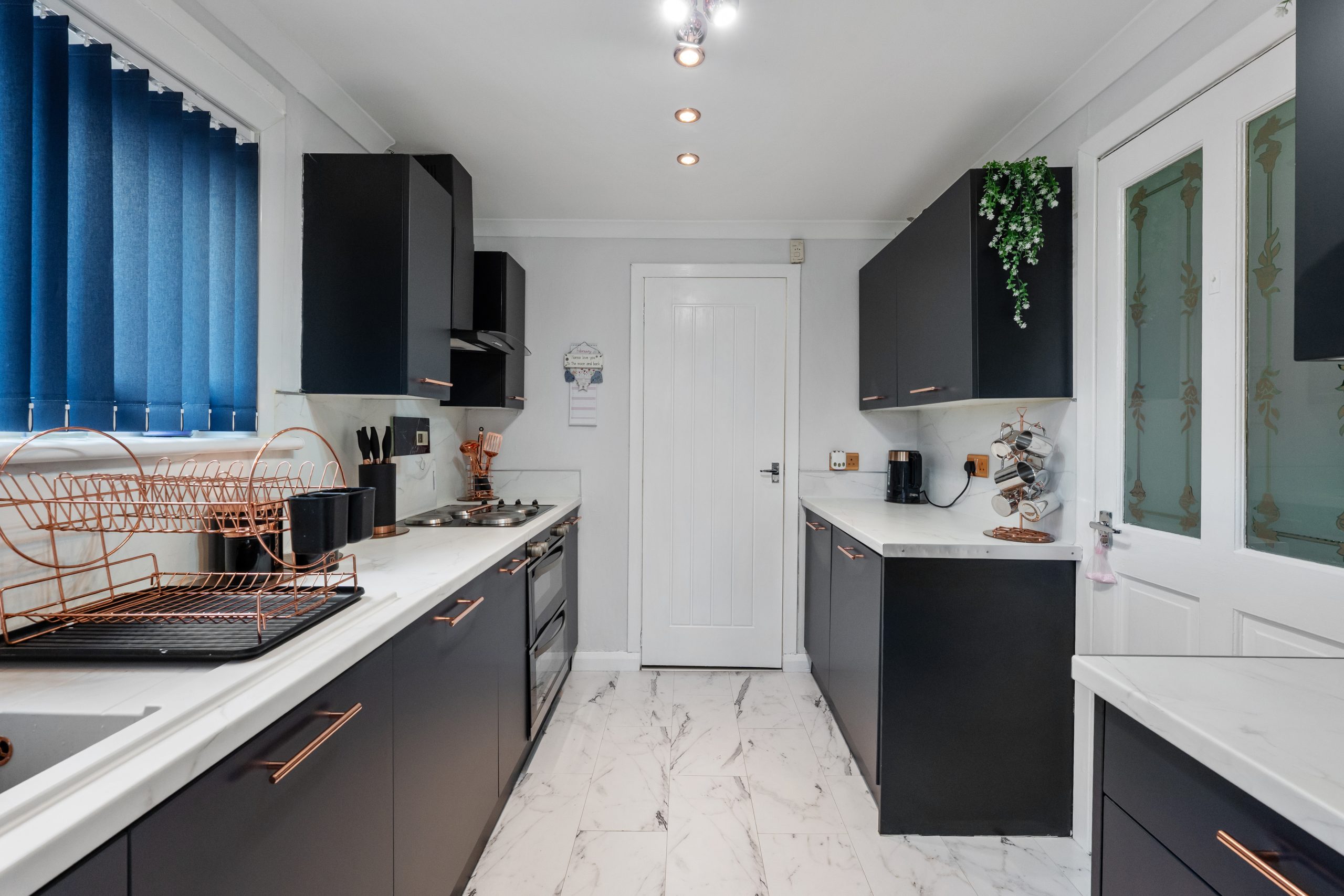 A new modern navy kitchen with white modern worktops, integrated appliances and white marble effect laminate tiles and wetwall finish on walls, large walk in cupboard which is used as a utility room and storage for teh gas combi boiler.